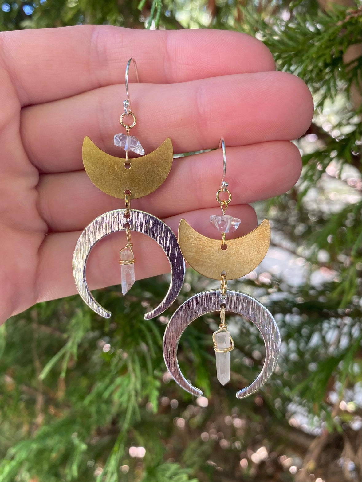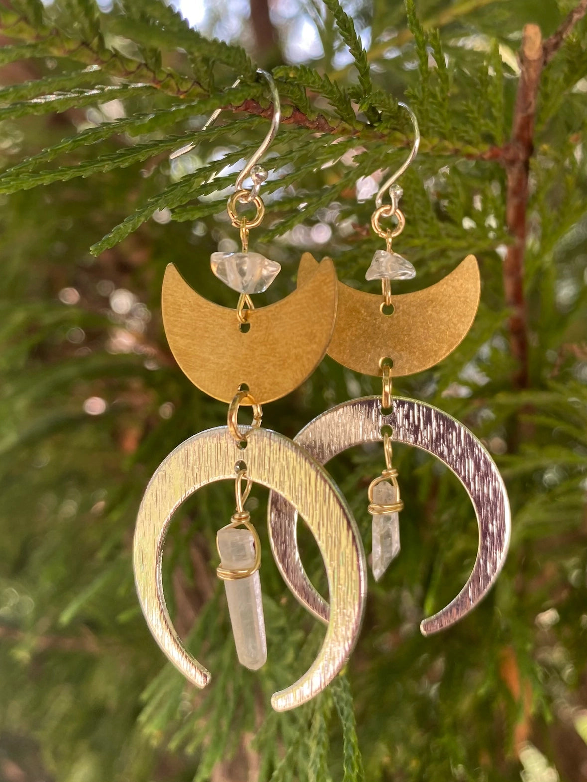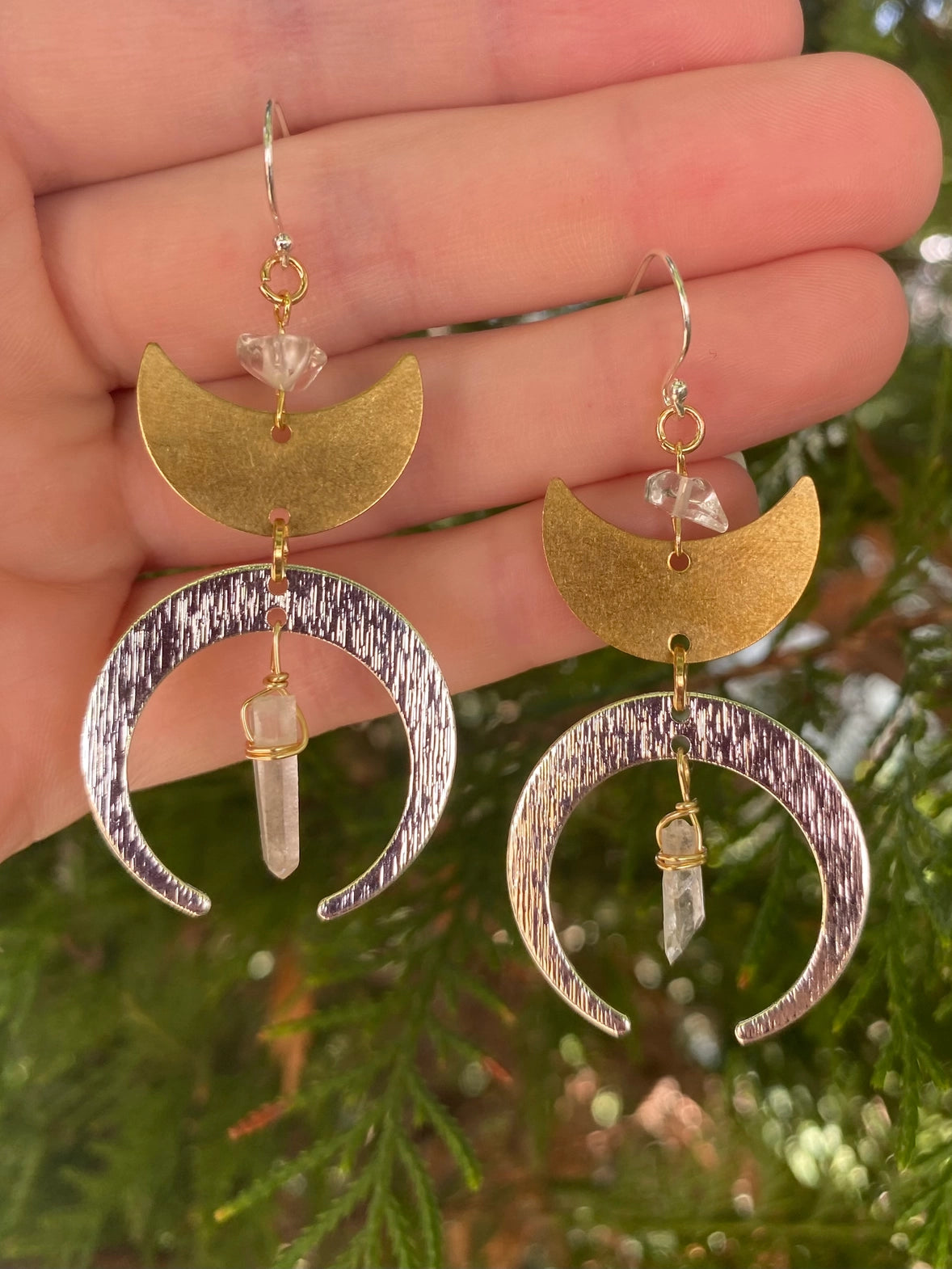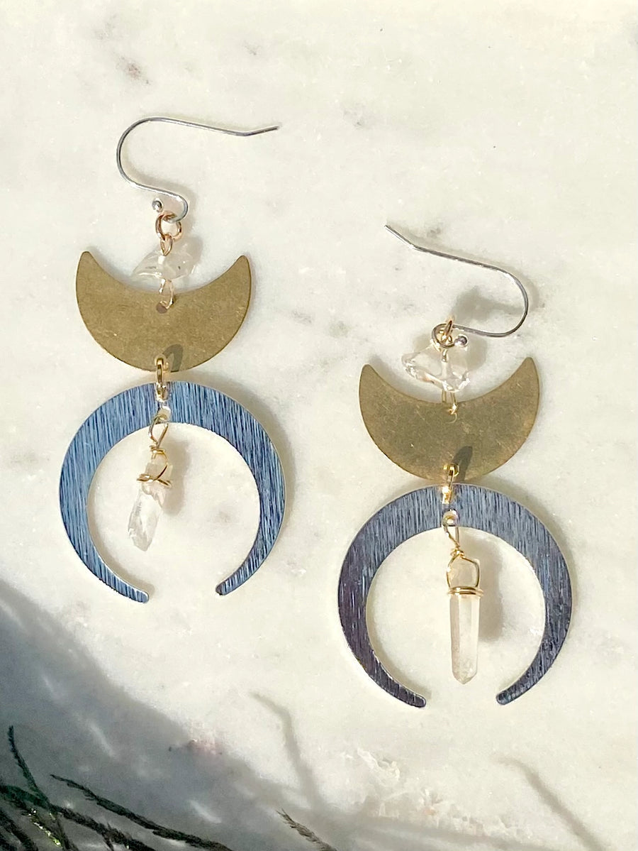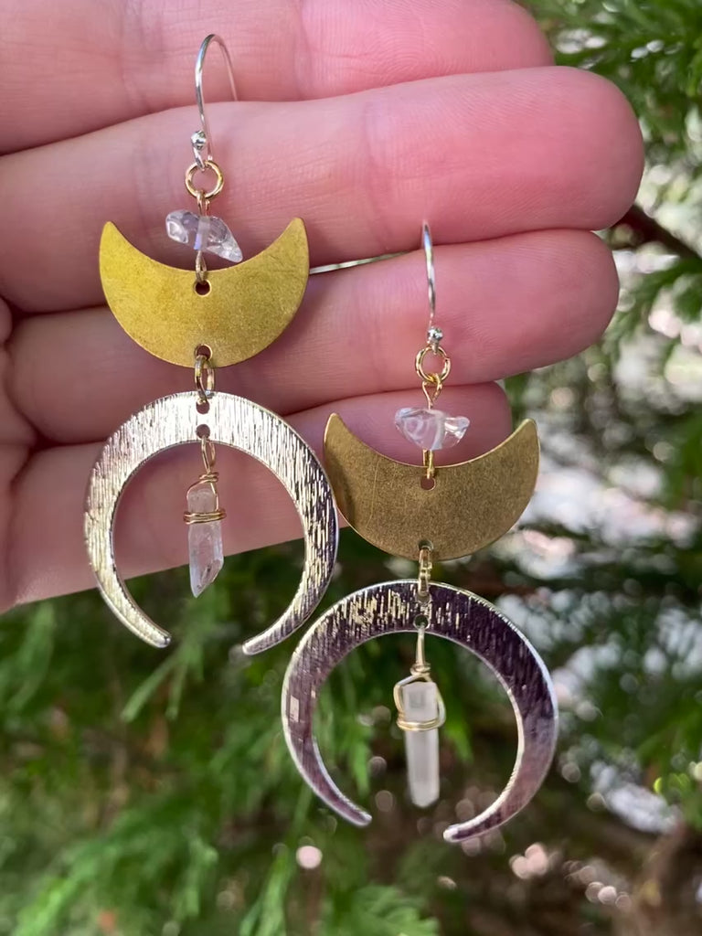 Channel your inner lunar energy with these stunning handcrafted crescent moon and quartz crystal mixed metal statement earrings made from brass, silver plated, and gold-plated materials. Adorned with raw clear quartz crystals, these witchy earrings are perfect for amplifying, clearing, and balancing one's energy.