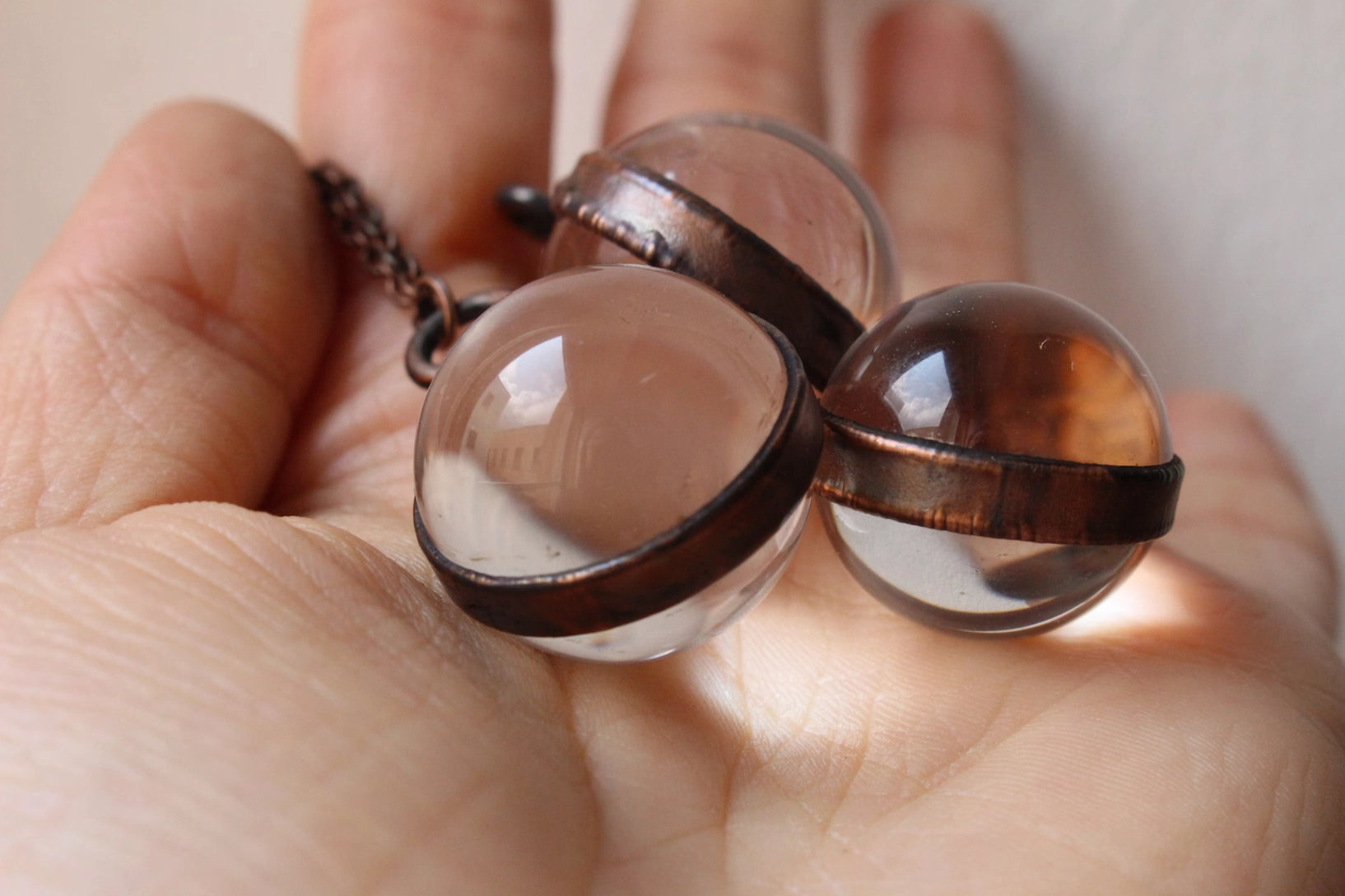 This clear quartz crystal ball pendant is created through the process of electroforming, or ‘growing’ copper onto a conductive object using positive and negative electrical currents. This process can take anywhere from 12 hours to up to 48+ hours. Every piece that created using electroforming is truly unique; no two are the same!