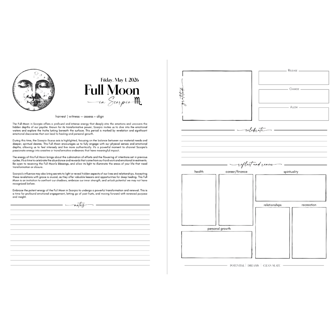 26 New Moon & Full Moon Spreads Dedicated two-page spreads for every New and Full Moon throughout the year, with information about each moon's sign and energy plus space to journal your intentions and visions.