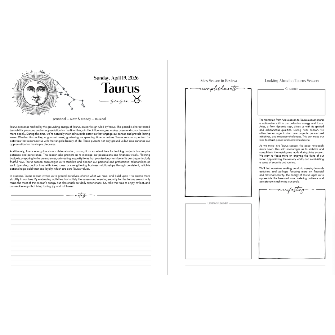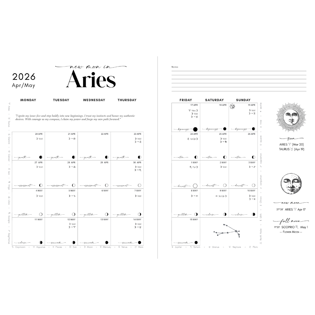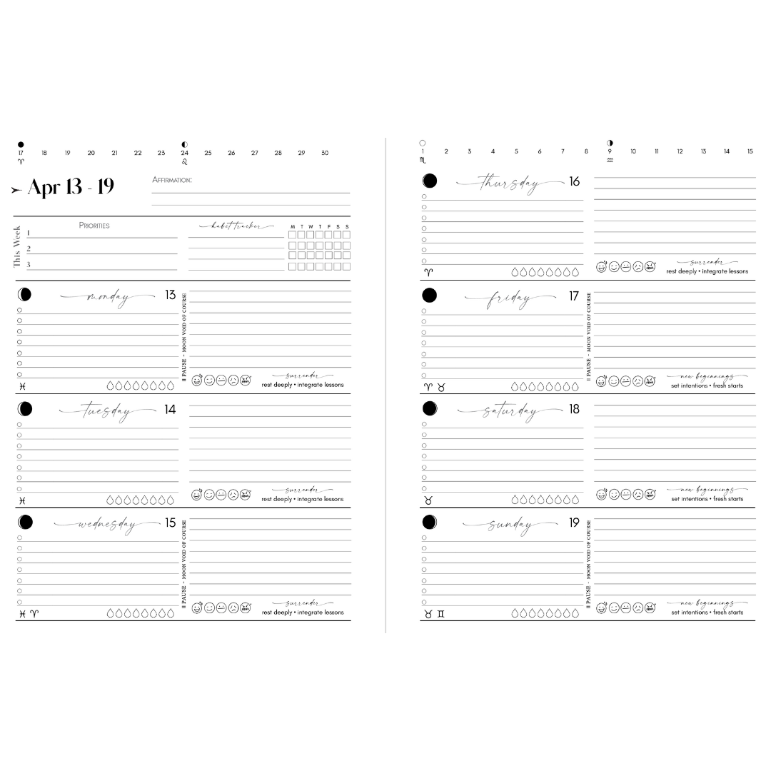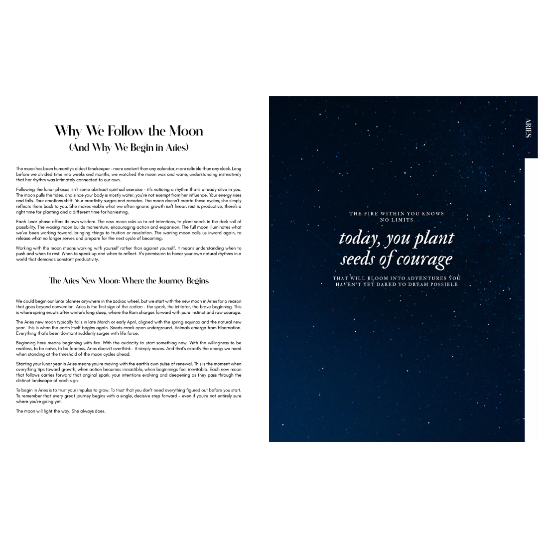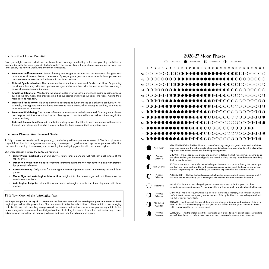 This planner runs for 13 complete lunar cycles from April 13, 2026 (New Moon in Aries - the astrological new year) through April 4, 2027. Unlike traditional planners, each monthly calendar begins on the New Moon rather than the 1st of the month, so you're always in sync with the lunar cycle.