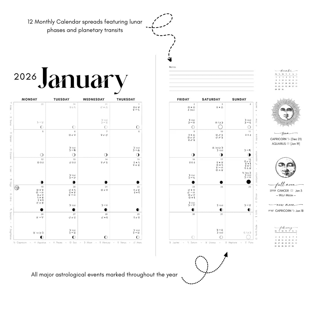 - 12 months of precise cosmic data including new/full moon dates, eclipses, retrogrades, void moons, and major planetary movements