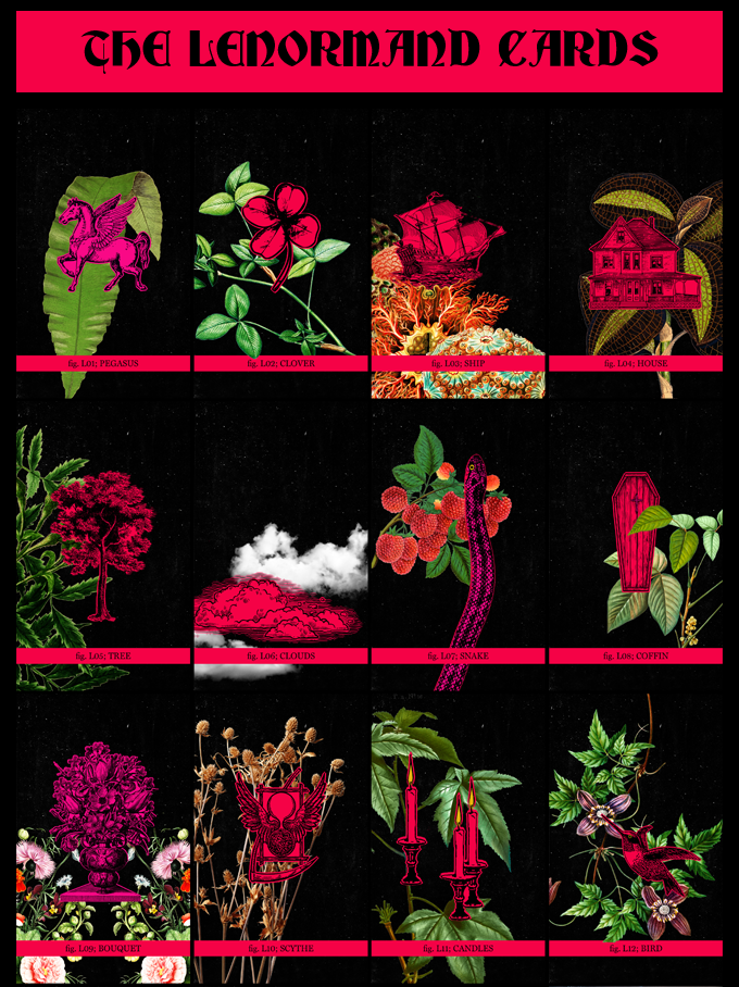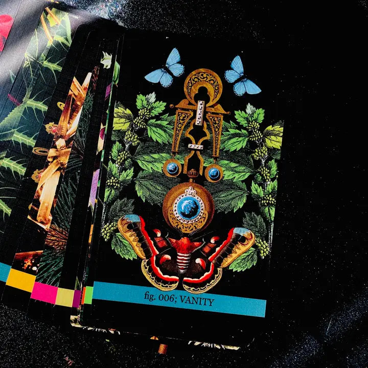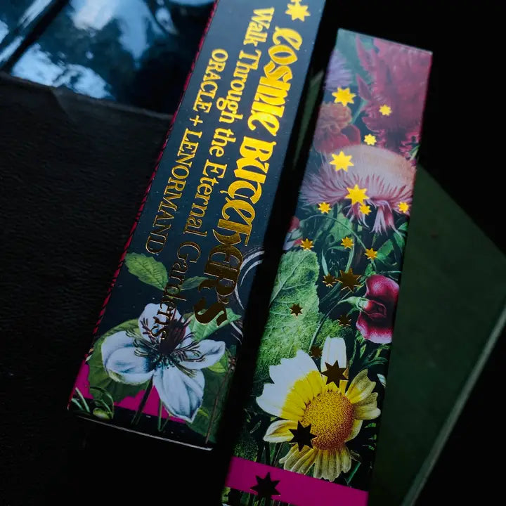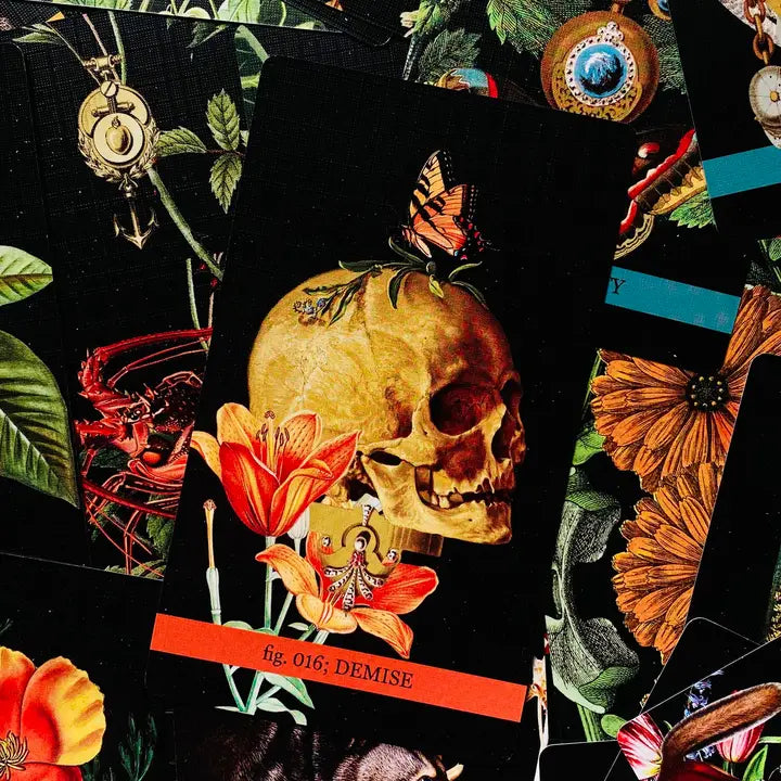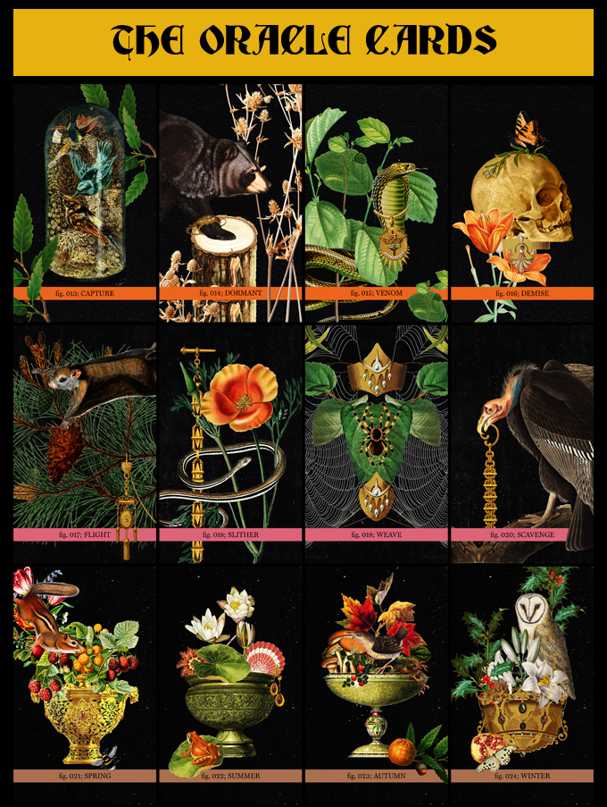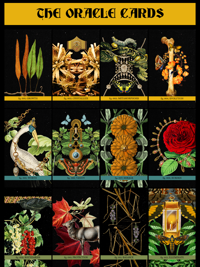 An eighty (80) card Oracle & Lenormand deck featuring lush botanicals entwined with elegant jewels and creatures in various stages of life.